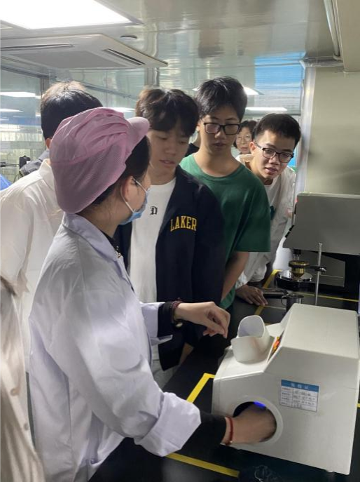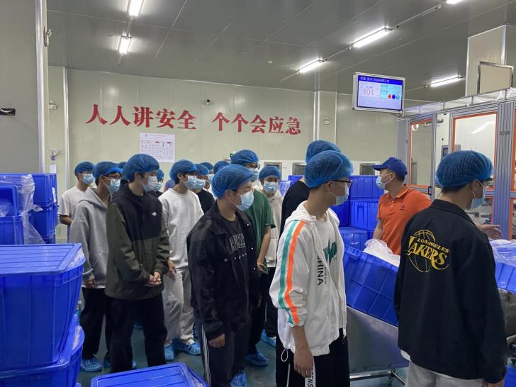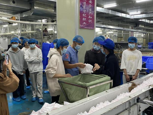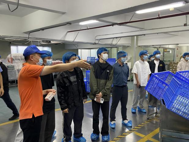 随后,在导师的带领下学员们实地走进生产现场,近距离学习了解生产工艺流程,包括原料采购、封装制备、剪裁压花、装配和黏合、整形和包装、质量检验等流程,了解岗位要求。