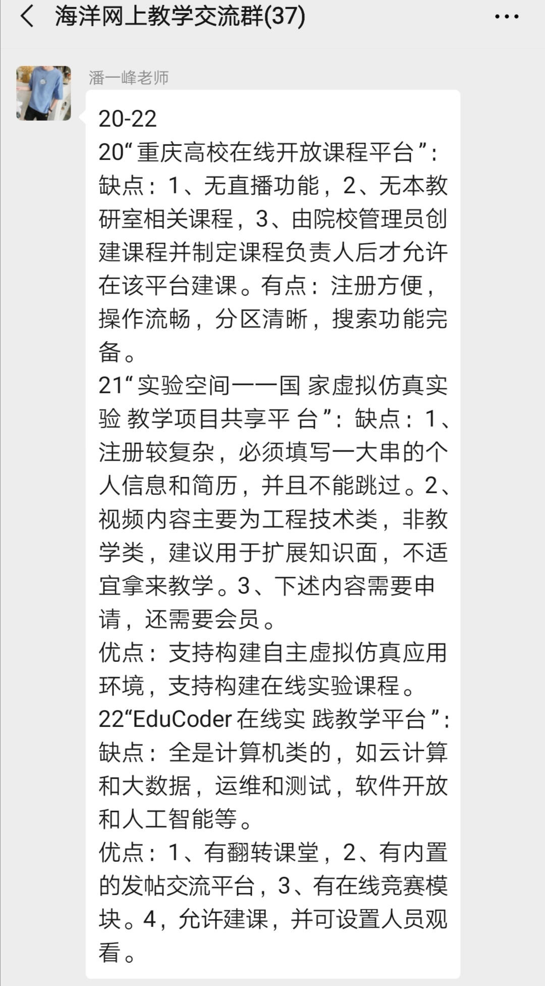 2月7日,海洋系在系部线上会议结束后当即成立了海洋网上教学交流群。自交流群成立起,一方有问题,八方来回应;一方有心得,即分享告知八方。全系教师拧成一股绳,齐心守好教育阵地。