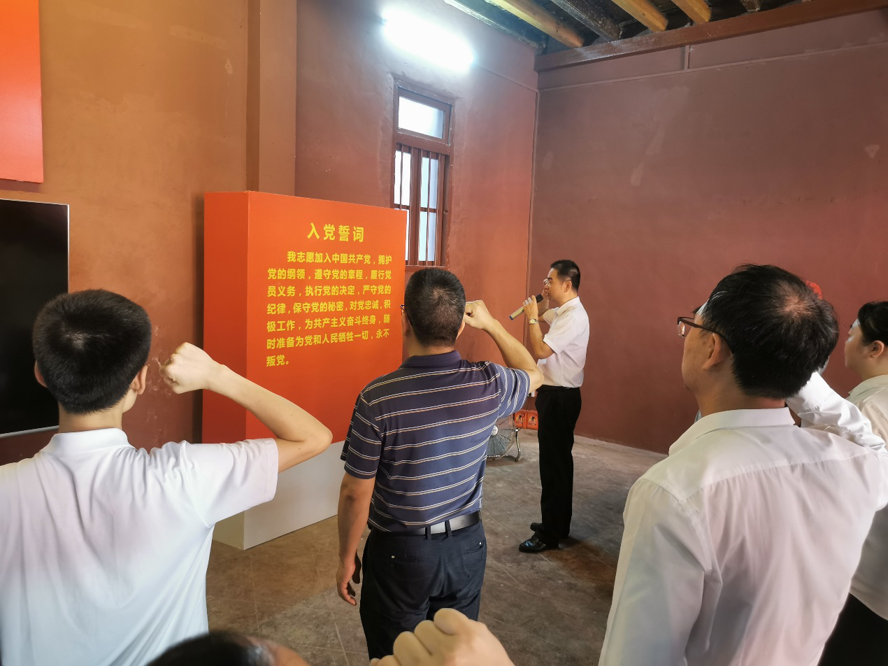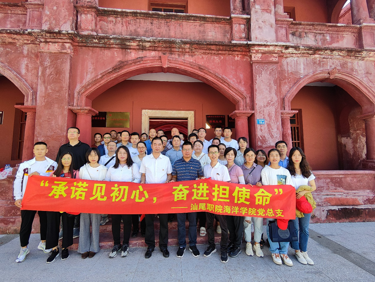 主题教育实践活动的第一站是田墘“红楼”革命遗址。“红楼见证了在大革命、土地革命、抗日战争和解放战争时期革命先烈的初心和使命。1927年,海丰县第七区苏维埃政府在此成立,这里的墙壁粉刷成红色,故称‘红楼’……”在现场,红色讲解员给党员同志们介绍了红楼历史。在认真瞻仰“红楼”革命遗址后,海洋公司党总支书记陈昌文同志给大家上了一堂生动的微党课,带领大家重温《中国共产党章程》中党员的义务。图书馆馆长罗修扬同志带领大家高举右手,面对党旗再次庄严宣誓,重温入党誓词的庄严承诺和坚定决心。