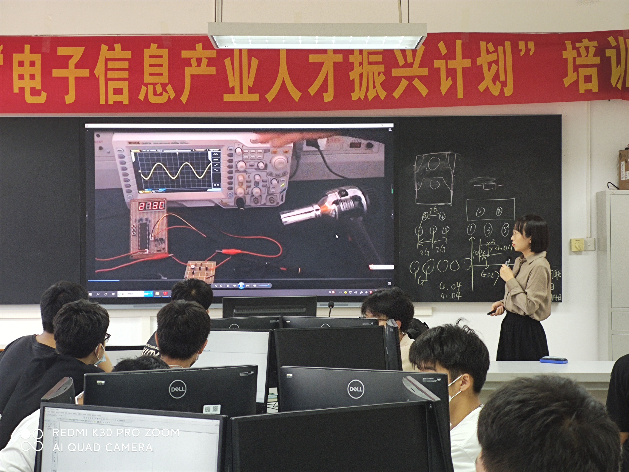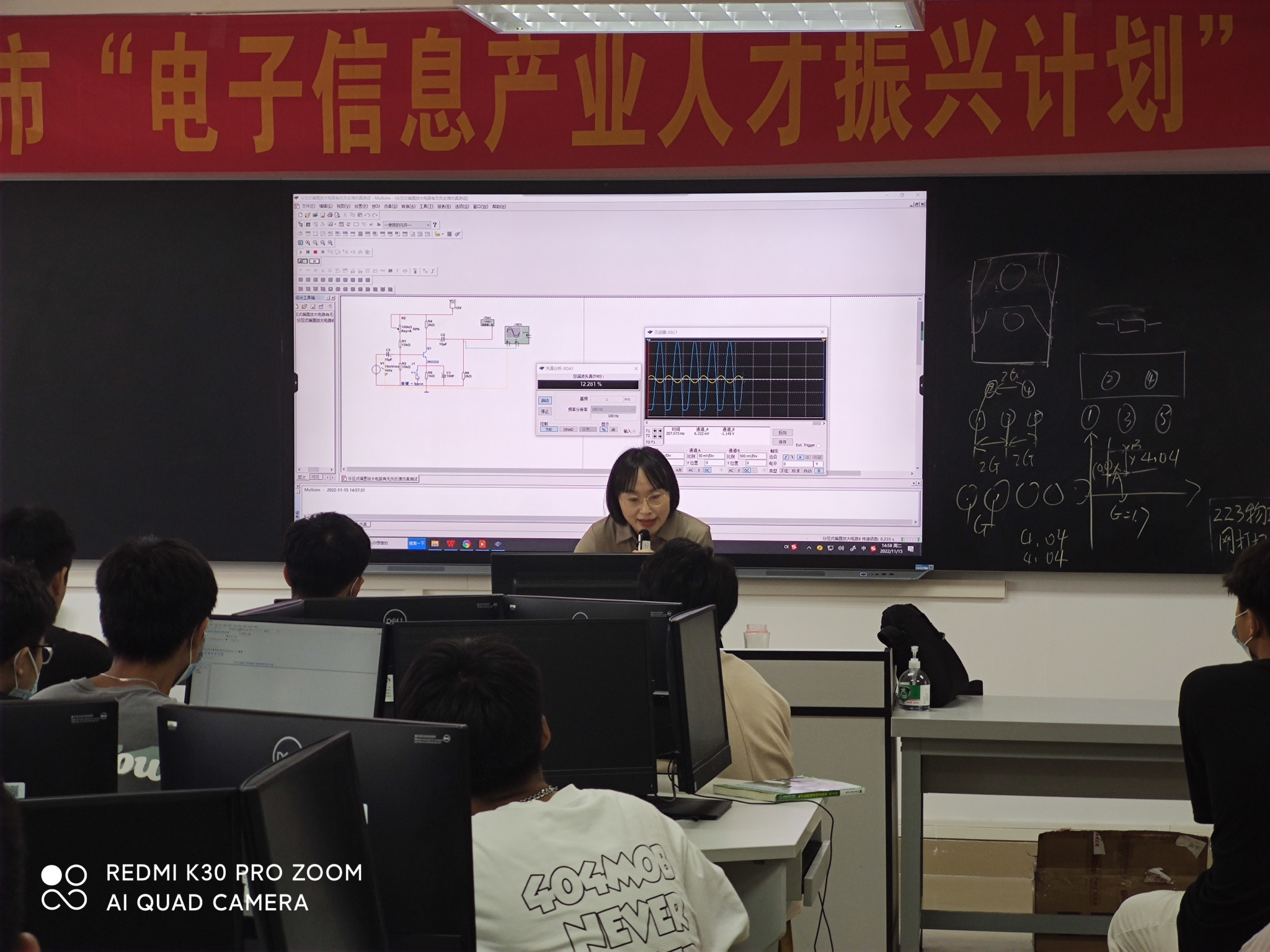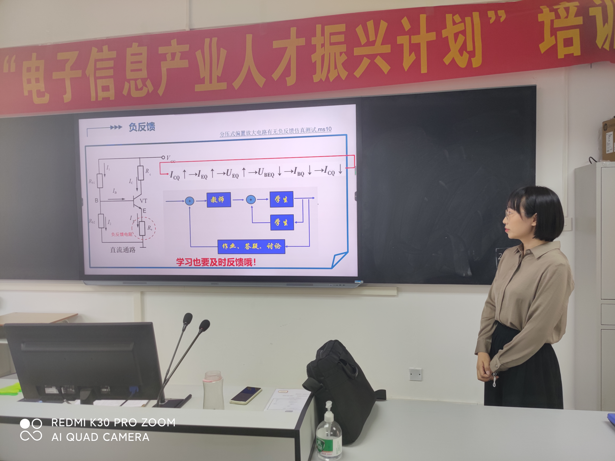 彭安娜老师讲课充满激情,合理使用现代化教育技术,员工学习参与度高,课堂纪律好。由于课程内容理论性较高,彭老师还利用虚拟仿真软件Multisim直观地向员工展示分压式偏置放大电路对稳定静态工作点的作用。