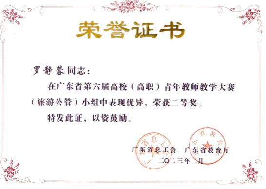 2月13日,广东省第六届高校(高职)青年教师教学大赛决赛圆满落幕,公司罗静蓉老师表现突出,荣获二等奖。
