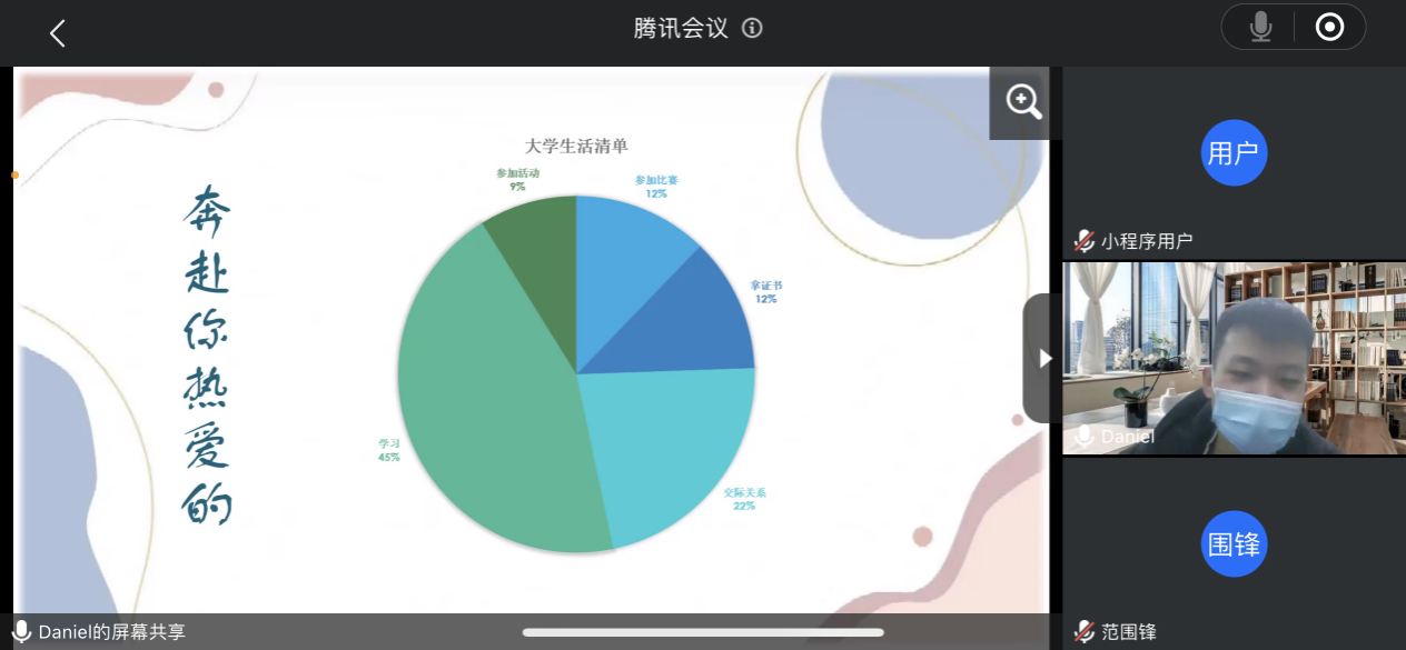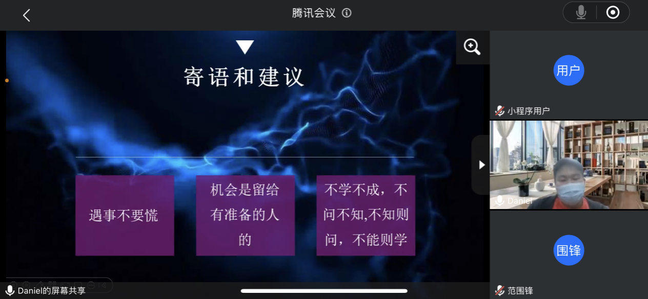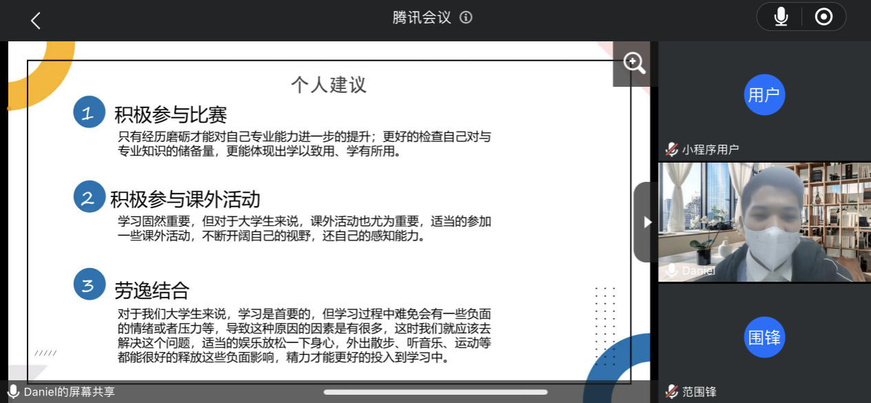 接着,2021-2022学年国家奖学金获得者陈永春、江颖和2021-2022学年国家励志奖学金获得者张贵清、赖振涛和陶伟森五名同学分别从思想、学习、生活、工作、参赛经历、兴趣爱好等方面和大家做了详尽的分享交流,并建议师弟师妹们要做好职业生涯规划和时间规划,多参加活动,多与老师、同学们交流,找到适合自己的发展之路,选定目标、持之以恒,过有意义的老员工活。