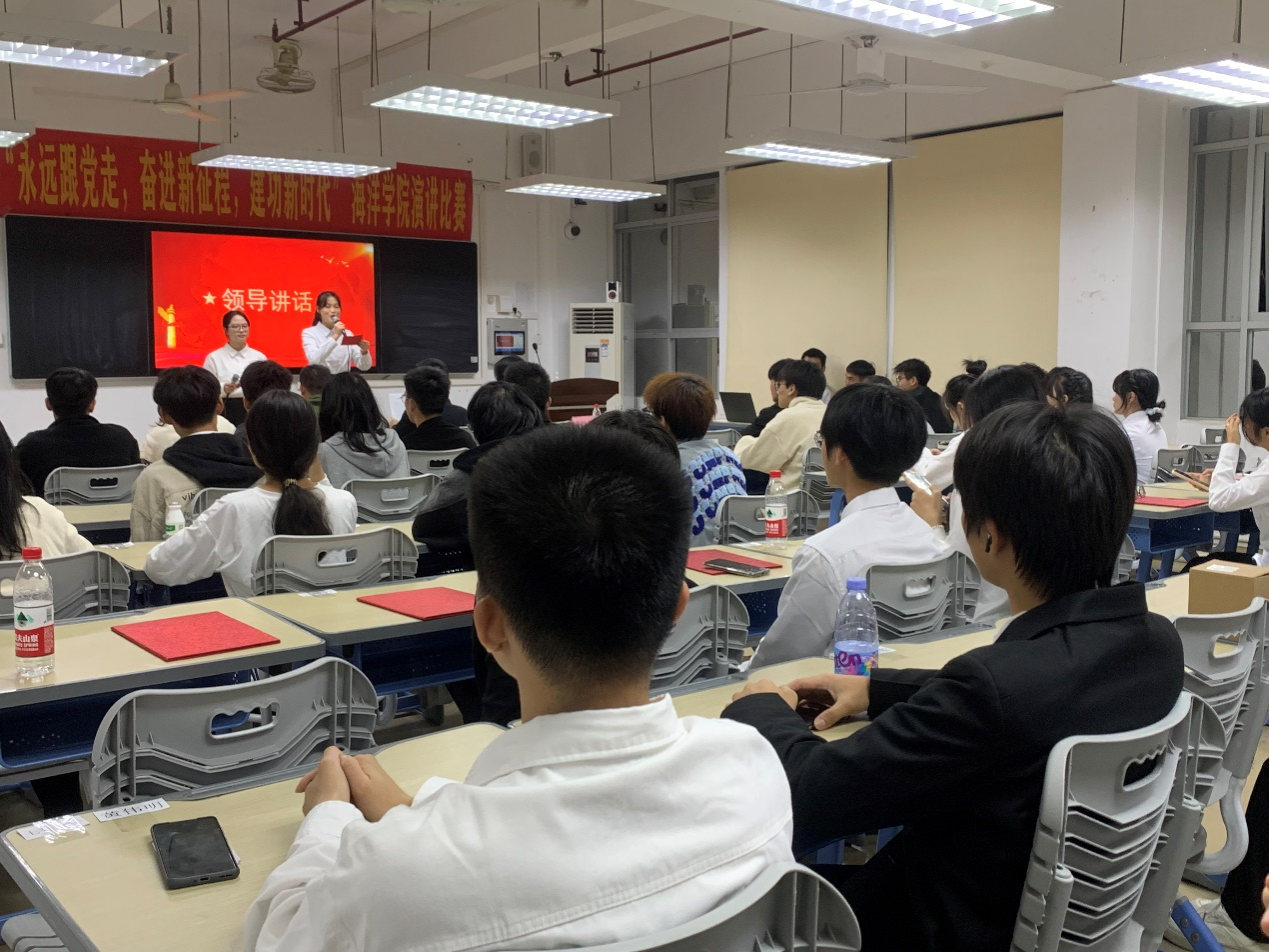 “大鹏一日同风起,扶摇直上九万里。“中华民族从沉沦到奋进,由苦难向辉煌的发展史,得益于红色基因的有力托举。传承红色基因,再返红色征途,你我将肩担日月,心怀家国,承先烈之明志,续今朝之长歌。12月1日晚上,公司于求真楼803教室举办“永远跟党走,奋进新征程,建功新时代”演讲比赛。海洋公司党总支副书记、副经理陈倚重老师和全体辅导员出席了本次活动,各班员工观众及员工志愿者观摩了本次比赛。