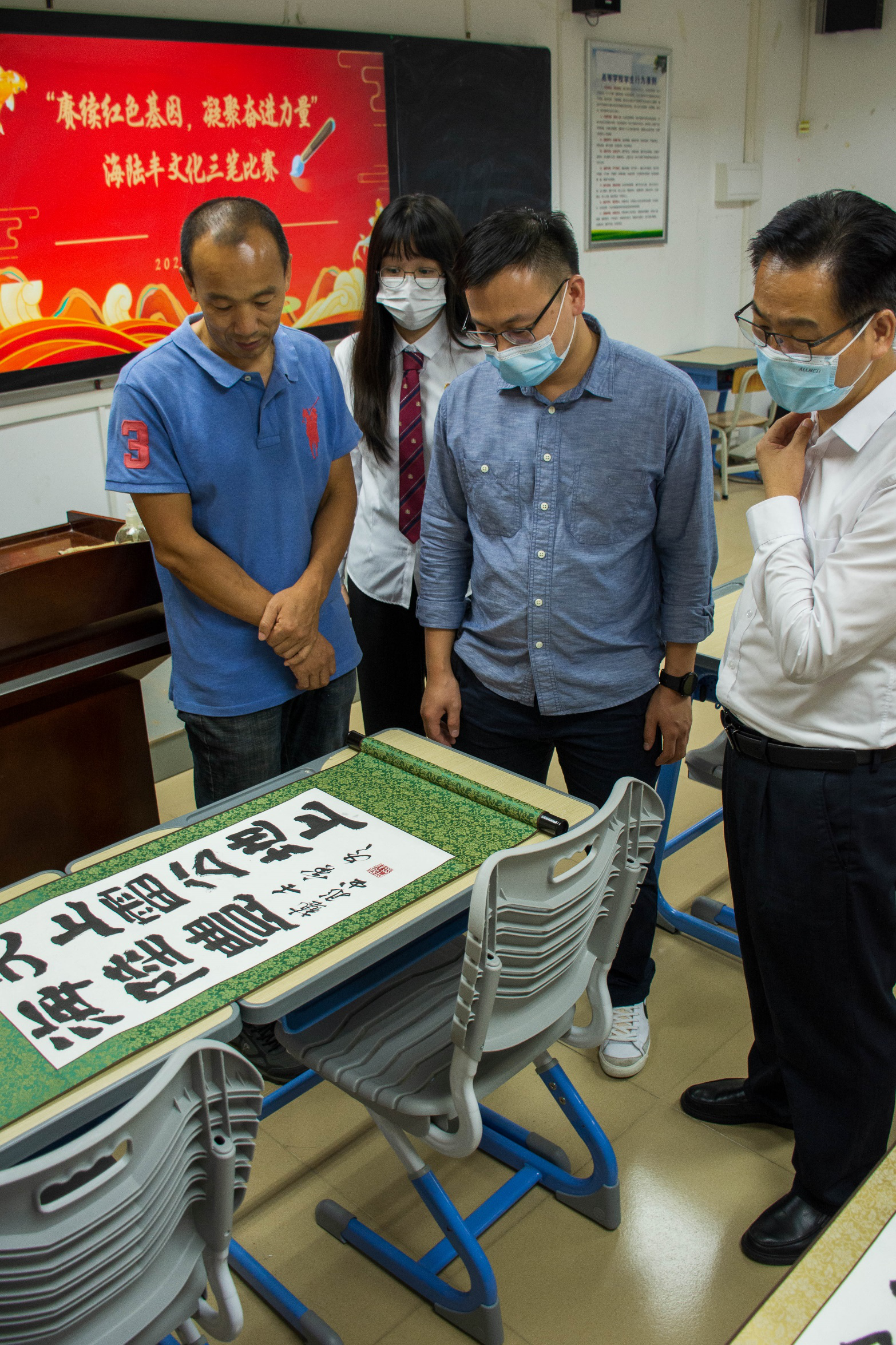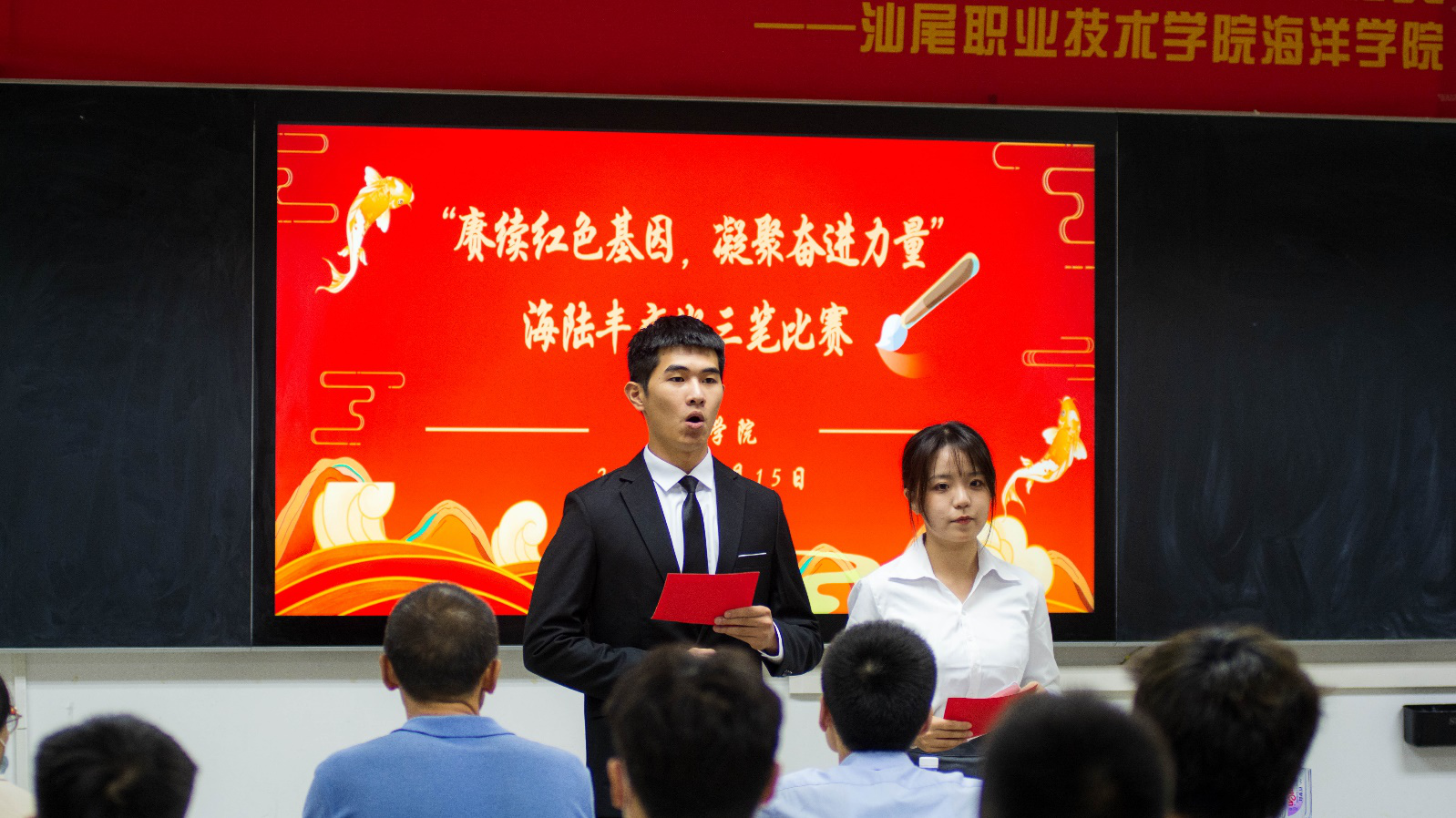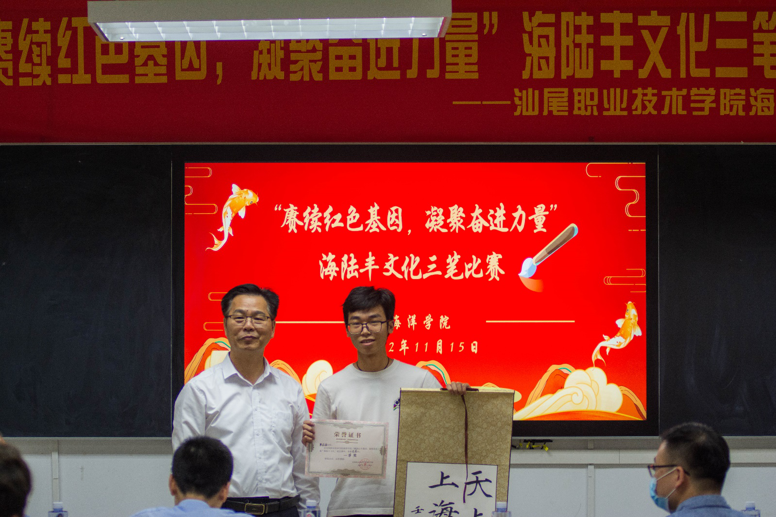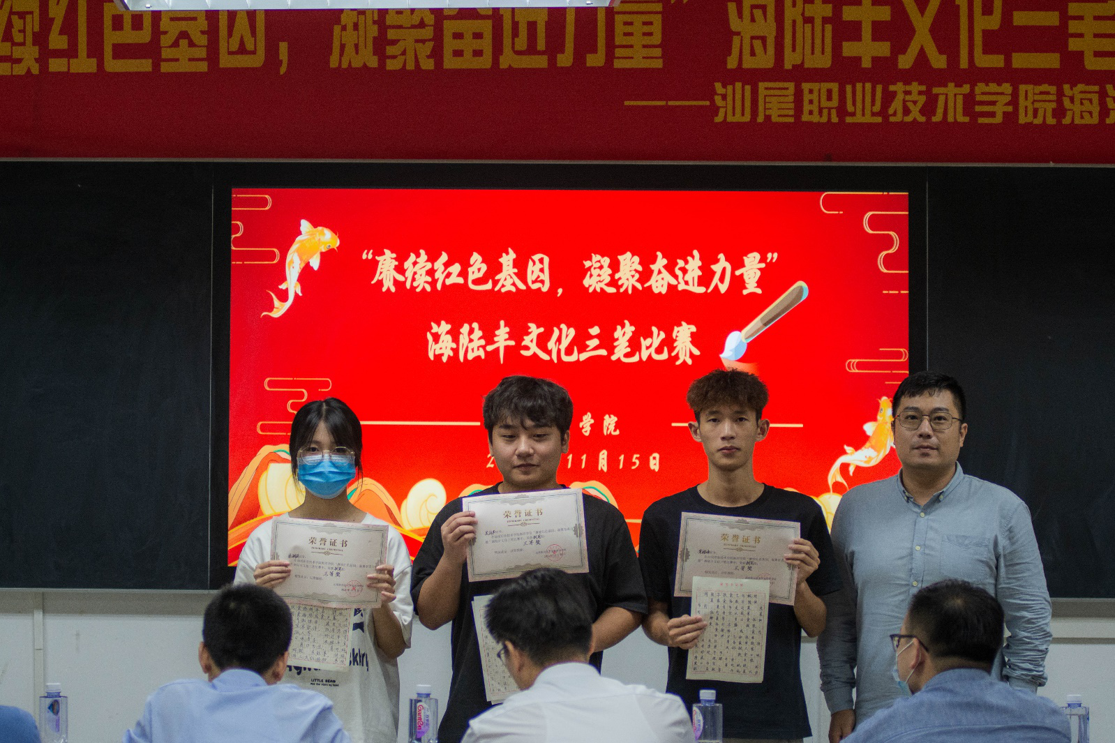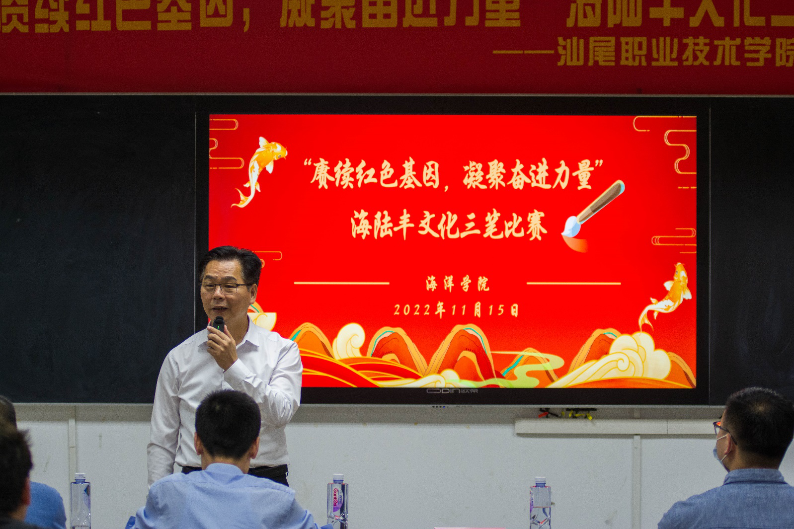 为促进员工传承“敢为人先、依靠群众、敢于斗争、无私奉献”的海陆丰革命精神,同时提高员工的基本技能,展示员工的风采,2022年11月15日晚,公司在求真楼801、803、810教室举办了以“赓续红色基因,凝聚奋进力量”为主题的海陆丰文化三笔比赛。出席本次比赛的有汕尾职业技术公司党委委员、组织人事处处长赖祥溢,海洋公司党总支副书记、副经理陈倚重、书法协会指导老师林泽凯、爱好书法的专任教师王有坤、公司全体辅导员、员工会员工志愿者及各年级参赛选手。