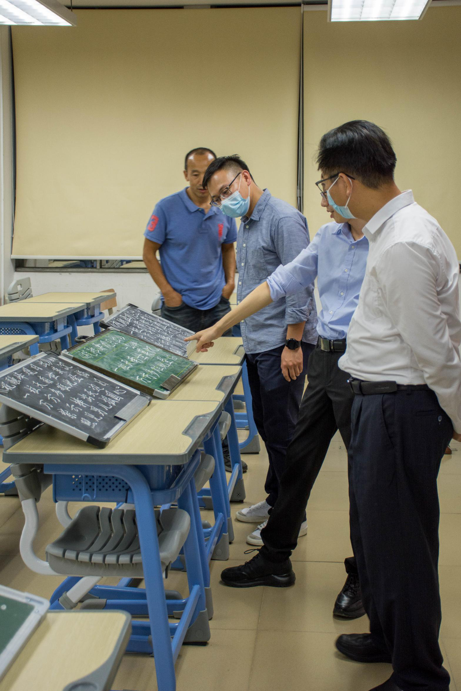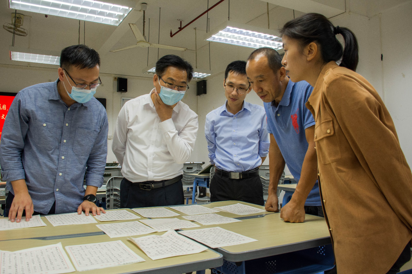 书写完毕后,同学们的作品由工作人员拿到801教室。几位评委老师根据字体结构、笔画流畅性、整体感等多个专业的角度对员工书法作品的优缺点和特色进行深入地分析和激烈地探讨。