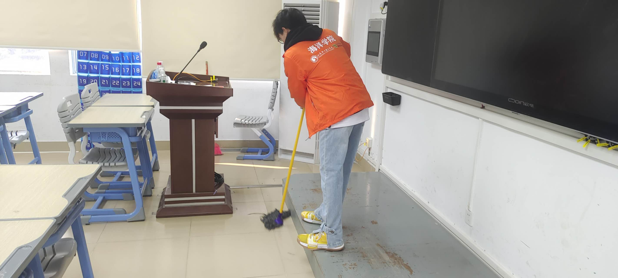 早上八时,志愿者们着橙色志愿者服在求真楼八楼集合。分工合作,对各教室进行了全面认真地清理打扫。同学们齐心协力清理卫生死角,不放过任何一处小细节。