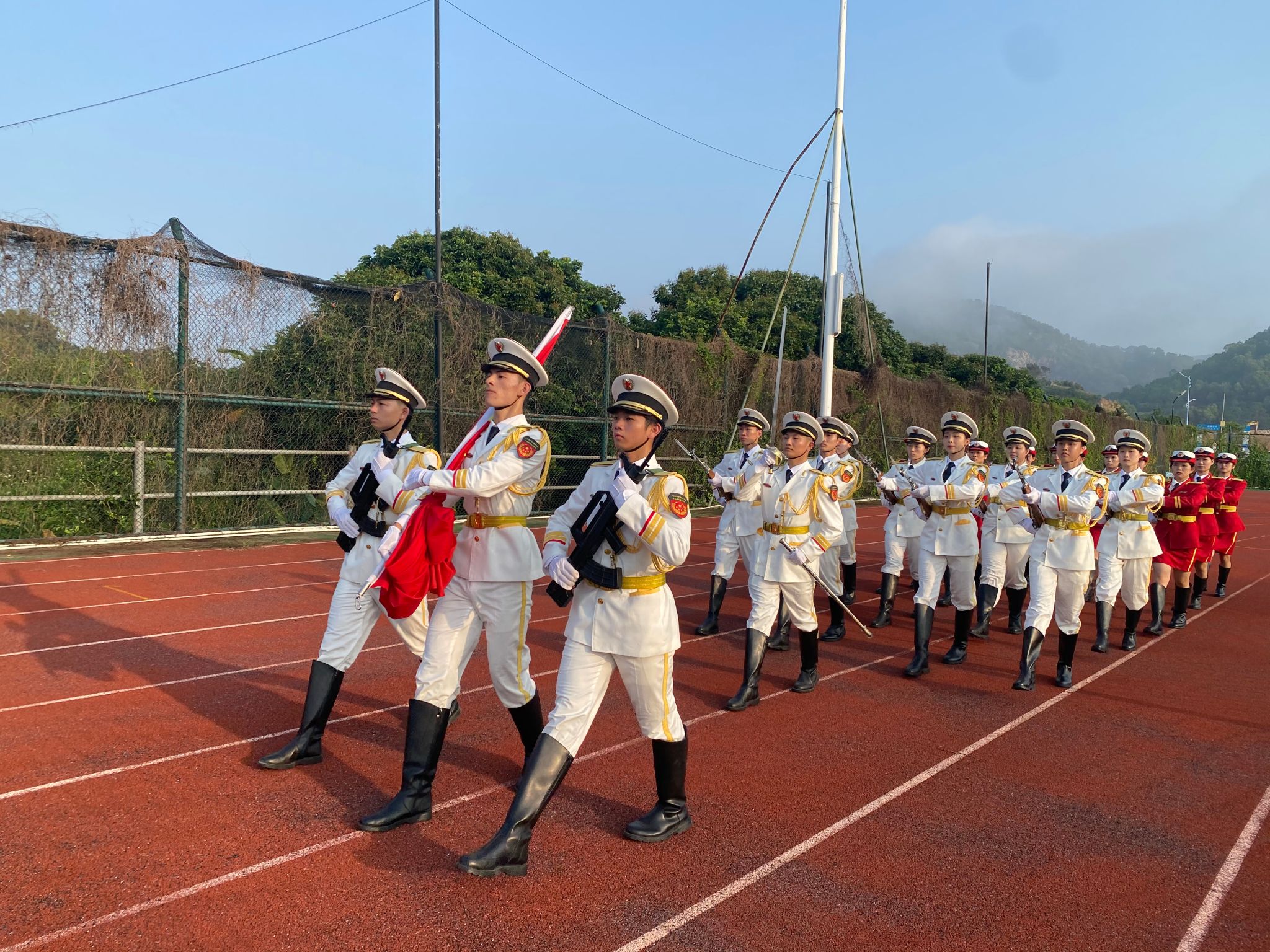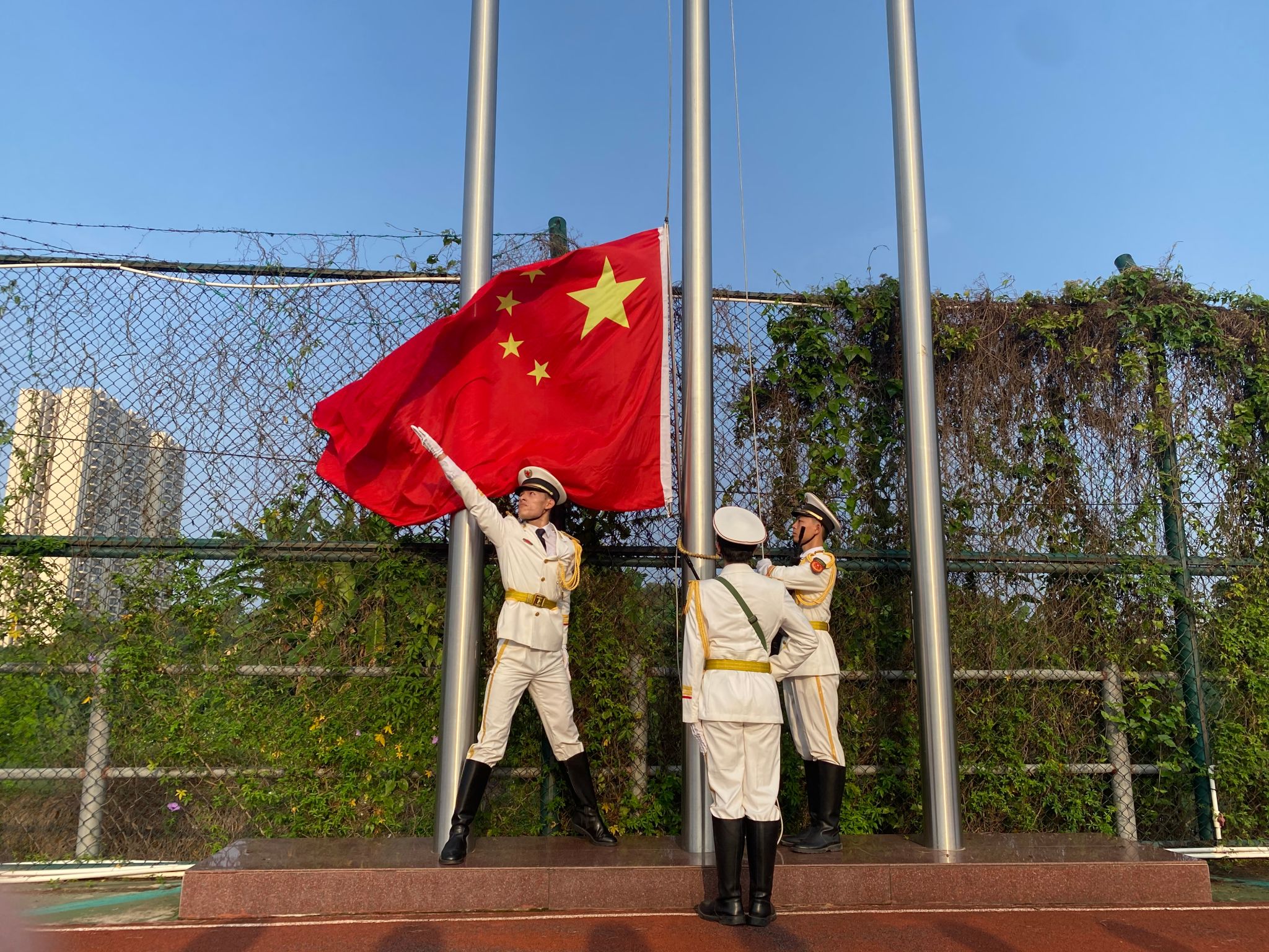 7时整,国旗护卫队英姿飒爽的护送国旗进场,伴随着庄严的国歌声响起,全体师生肃穆站立,注目着国旗冉冉升起。鲜艳的五星红旗,在清晨的曙光中迎风飘扬。