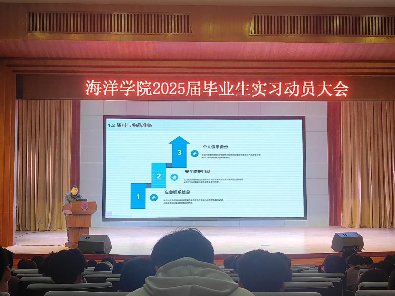 海洋公司党总支书记、经理陈昌文在讲话中通过五个关键词向即将走向顶岗实习单位的同学们提出期望和勉励:首先,要明确实习是一门课程,充分认识实习的目的和重要性,合理规划实习生活;其次,要深刻认识到角色的转变,在实习中积极进行心理重构,确立清晰的目标,迅速适应新身份;第三,要珍惜实习机会,秉持主动学习的态度,积极沟通,在实习岗位上不断提升自己;第四,要强化共同体意识,严守实习单位的纪律,展现出良好的形象和职业素养;第五,注重安全,要注意交通、信息、消防、用电、生产各方面的安全,时刻保持警惕,保护自己,与实习指导教师、班主任、辅导员保持联系与沟通。