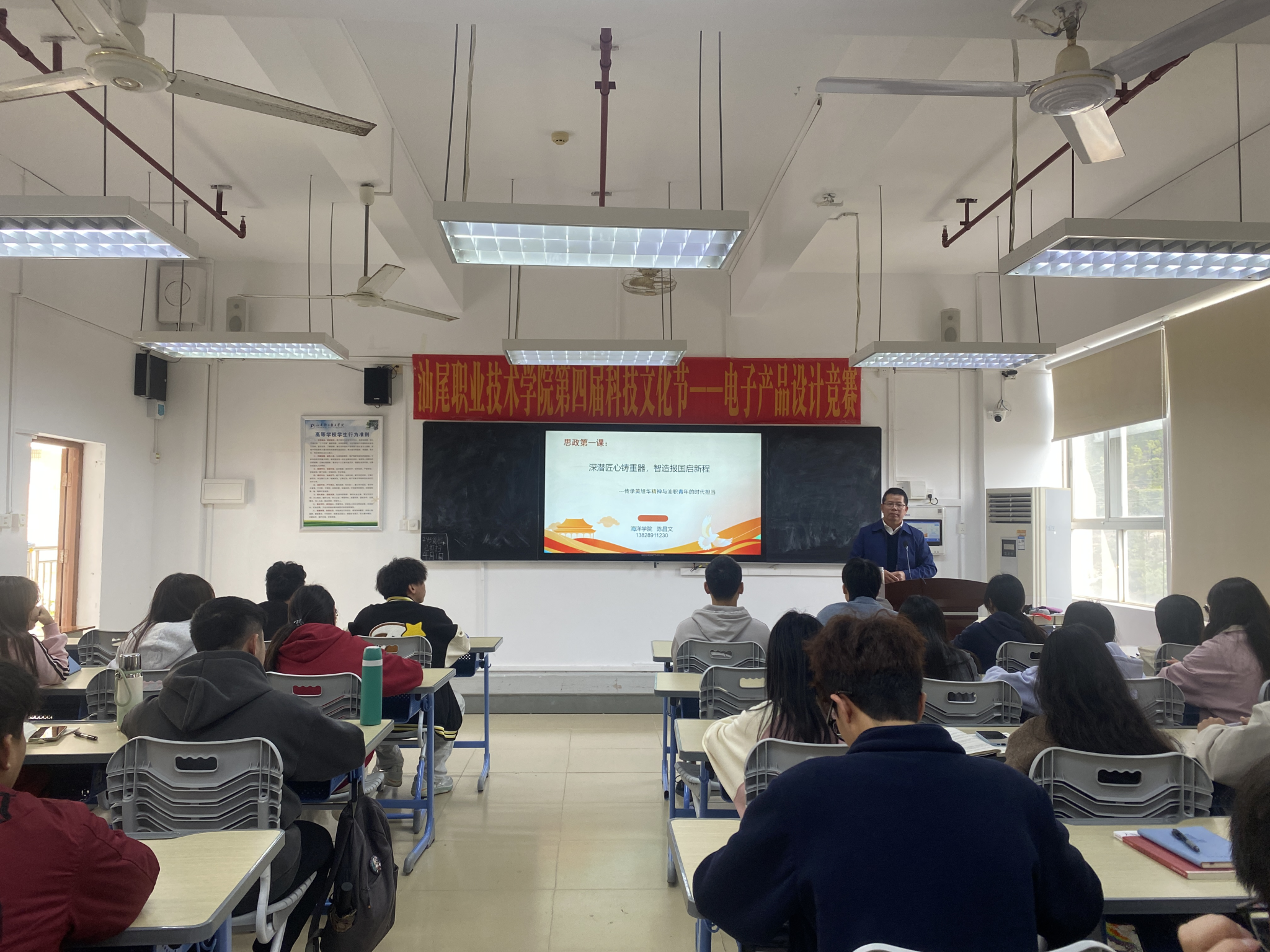 2025年4月2日下午,海洋公司党总支书记、经理陈昌文在求真楼803教室为50余名员工干部讲授了一堂生动的“思政第一课”。他以《深潜匠心铸重器,智造报国启新程——传承黄旭华精神与汕职青年的时代担当》为主题,号召青年学子传承“中国核潜艇之父”黄旭华精神,勇担智能制造时代使命。